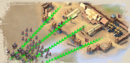 「滾木礌石」:防守方消耗輜重對(duì)云梯進(jìn)行攻擊,直接砸向云梯排隊(duì)的部隊(duì),直接重傷遣返回去。