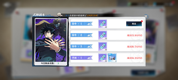 3、隨著你的戰(zhàn)力不斷提升,在式神副本中挑戰(zhàn)更高級(jí)的難度副本,可以獲得更高品質(zhì)的式神碎片,每天挑戰(zhàn)的次數(shù)記得一定要完成,產(chǎn)出的材料性價(jià)比很高,就算花費(fèi)鉆石完成也是必須的。